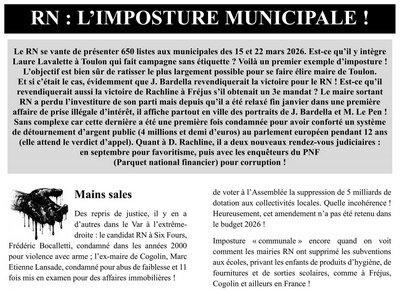 Le RN se vante de présenter 650 listes aux municipales des 15 et 22 mars 2026. Est-ce qu’il y intègre Laure Lavalette à Toulon qui fait campagne sans étiquette ? Voilà un premier exemple d’imposture ! L’objectif est bien sûr de ratisser le plus largement possible pour se faire élire maire de Toulon. Et si c’était le cas, évidemment que J. Bardella revendiquerait la victoire pour le RN ! Est-ce qu’il revendiquerait aussi la victoire de Rachline à Fréjus s’il obtenait un 3e mandat ? Le maire sortant RN a perdu l’investiture de son parti mais depuis qu’il a été relaxé fin janvier dans une première affaire de prise illégale d’intérêt, il affiche partout en ville des portraits de J. Bardella et M. Le Pen ! Continuer de lire Élections municipales dans le Var : tract de la coordination contre l’extrême droite
