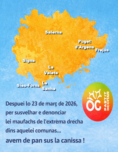 Sur les 17 listes d’extrême droite qui seront présentes dans le Var le 22 mars 2026 au second tour des élections municipales, 8 sont arrivées en tête à Toulon, La Seyne, Six-Fours, La Valette, Le Beausset, Signes, Salernes et Draguignan. Et des candidat·es RN ou UDR sont arrivé·es en deuxième ou troisième position à La Garde, Le Pradet, Solliès-Pont, Hyères, Saint-Maximin-la-Sainte-Baume, Cogolin, Les Arcs, Roquebrune-sur-Argens et Vidauban. Alors, dans ces 17 communes, les électeurs/trices et les abstentionnistes du premier tour doivent se mobiliser massivement pour faire barrage à l’extrême droite. Car les choix politiques des municipalités et des intercommunalités ont un impact majeur sur notre vie quotidienne. Elles décident pour l’accès et la construction de logements, l’accueil de la petite enfance, la gestion des écoles, l’organisation des transports, l’animation et la vie culturelle, le soutien à la vie associative, les équipements sportifs, la préservation de l’environnement… autant de domaines où l’action de l’extrême droite, lorsqu’elle est au pouvoir, est particulièrement néfaste et contraire aux intérêts des habitant·es ! Continuer de lire Le Partit Occitan du pays toulonnais appelle à faire barrage à l’extrême droite