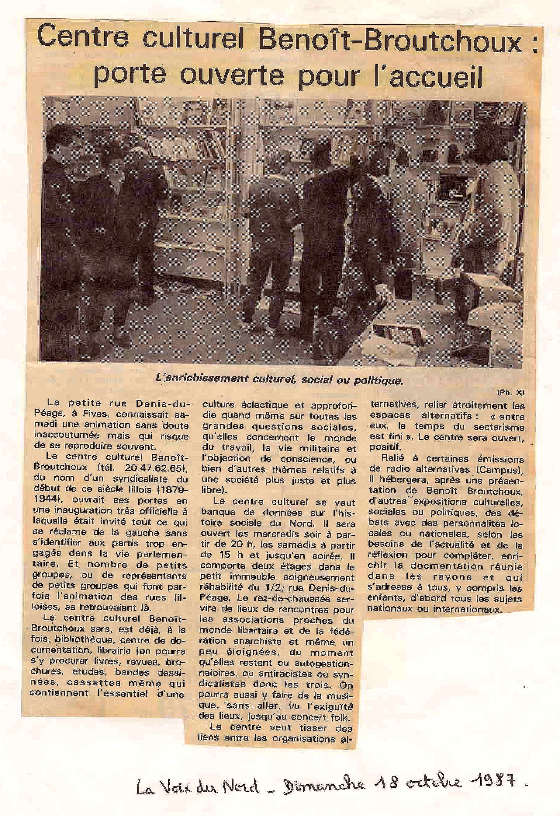 Enfin, même si la FA a été à l’origine du CCL, on ne peut pas dire – comme le fait La Brique – que celui-ci n’a été qu’une « tribune politique, […] simple émanation du groupe local de la Fédération Anarchiste ». En effet, dès le départ, le CCL de la rue Denis du Péage a été conçu comme une structure non dogmatique devant permettre une ouverture au-delà des milieux anars traditionnels (cf. la présentation qui en est faite dans La Voix du Nord le lendemain de son inauguration). À ce propos, la référence à Benoît Broutchoux (un nom qui, dès le début, a eu parfois tendance à se substituer au mot « libertaire » dans l’intitulé du centre culturel) n’est pas un hasard, ce militant ouvrier très actif au début du XXe siècle dans le bassin minier du Pas-de-Calais (mais pas seulement) étant connu pour son anarchisme non doctrinaire, sa gouaille, son activité au sein du syndicat CGT des mineurs, son engagement en faveur de la libre maternité et sa culture très éclectique. Alors, contrairement à ce qu’écrit La Brique, le CCL n’a pas attendu de s’installer à Wazemmes pour devenir « lieu des possibles », « lieu d’accueil » et « relais de multiples initiatives ». D’autant plus que – sur le plan statutaire – il s’est transformé très vite en une association loi 1901 totalement indépendante de la FA, cela permettant à différentes structures n’ayant aucun rapport avec l’idéologie libertaire – au sens fermé ou historique du terme – d’en devenir membres à part entière. Deux exemples particulièrement révélateurs : les Flamands roses (groupe d’expression gay et lesbienne qui a fait du CCL son nid douillet pendant de longues années) et l’AZADEL (association d’expatriés zaïrois œuvrant pour un autre développement économique et politique en Afrique). Parallèlement, plusieurs dizaines de personnes non organisées politiquement ont adhéré au CCL à titre individuel. Quant à la CNT (organisation syndicale qui se reconstituait à cette époque à Lille), elle y a établi son siège et s’est investi dans l’animation du lieu, en faisant une sorte de petite Bourse du travail sur le modèle de ce que préconisait Fernand Pelloutier à la fin du XIXe siècle. À partir de ce moment-là, le nom « Centre culturel libertaire » aurait pu être remplacé par « Centre culturel alternatif » ou « Centre social autogéré », formulations beaucoup plus proches de la réalité. Certes, à la différence du CCL de la rue de Colmar, le CCL de la rue Denis du Péage n’a jamais été une référence en matière de scène musicale alternative car le lieu n’était pas suffisamment insonorisé vis-à-vis du voisinage. Néanmoins, pendant dix ans, le CCL a accueilli plusieurs concerts acoustiques, dont certains particulièrement mémorables. Concernant « la diversité des activités », le programme était très varié tant au niveau du contenu (critique des médias dominants, lutte contre l’enfermement carcéral, antimilitarisme, éducation et pédagogies autogestionnaires, antifascisme, anticapitalisme, écologie, anti-sexisme, soutien aux luttes LGBT, internationalisme, présentation et promotion des syndicats et courants syndicaux s’inscrivant dans une démarche autogestionnaire et de lutte des classes, etc.) que de la forme (conférences, projections, débats, expositions, actions de prévention santé, ateliers d’écriture, formations syndicales, répétitions théâtrales, soirées festives, préparation de l’émission de radio « La voix sans maître », participation à un festival cinématographique consacré au tiers-monde, participation à la rétrospective de l’œuvre de Pier Paolo Pasolini, participation à la réédition de la BD Les aventures épatantes et véridiques de Benoît Broutchoux, participation à l’opération « Germinal, un autre regard » organisée lors de la sortie d’un film de Claude Berri réalisé à partir du roman « Germinal » de Zola, etc.). Concernant les « parcours qui pouvaient s’y déployer », ils étaient également très diversifiés (que ce soit en terme d’invité·e·s, de militant·e·s ou de publics) et des passerelles entre des milieux politiques, socio-économiques et culturels se fréquentant peu ou pas ont pu être amorcées (y-compris avec des habitant·e·s du quartier). Enfin, contrairement à ce qu’écrit La Brique, la « visibilité » du CCL de la rue Denis du Péage fut loin d’être « limitée ». Sa bibliothèque de prêt était utilisée régulièrement par plusieurs dizaines de personnes ; la plupart de ses réunion-débats attiraient plein de gens d’horizons différents et faisaient souvent l’objet de comptes rendus dans la presse régionale et parfois même sur FR3 ; ses locaux étaient utilisés ponctuellement par différentes associations et collectifs de lutte.