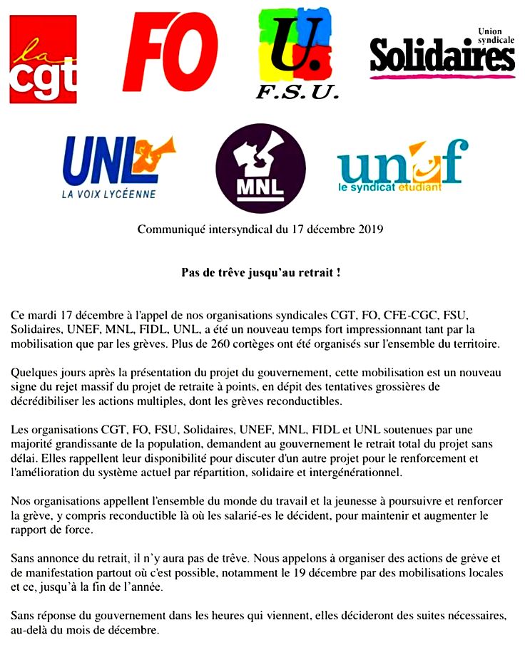 Communiqué de l’intersyndicale nationale interprofessionnelle suite à la grève du 17 décembre pour l’avenir des retraites :