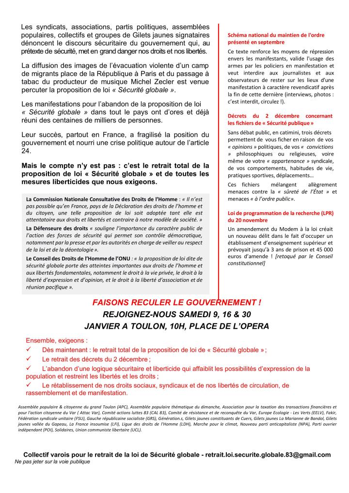 Le Collectif varois pour le retrait de la loi de sécurité globale appelle à poursuivre la mobilisation. Trois rassemblements (dont deux dans le cadre de l’appel du collectif national) sont organisés à Toulon au mois de janvier. Rendez-vous les samedis 9, 16 et 30 à 10h place de l’Opéra !