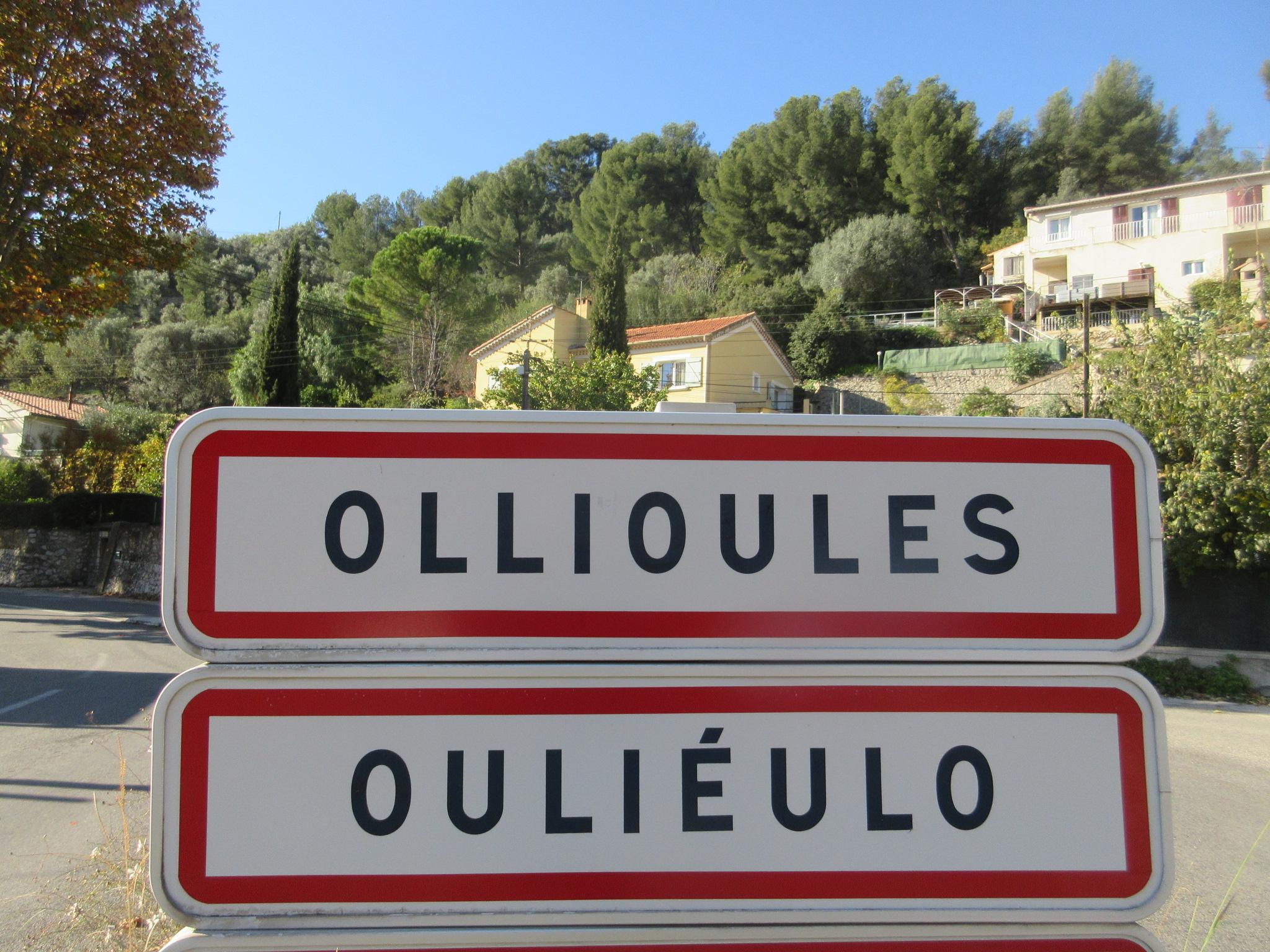 Panneau d’entrée bilingue (français et provençal) d’Ollioules / Ouliéulo (petite ville située en Provence à l’ouest de Toulon dans le département du Var). Crédit photo : Eric DUSSART