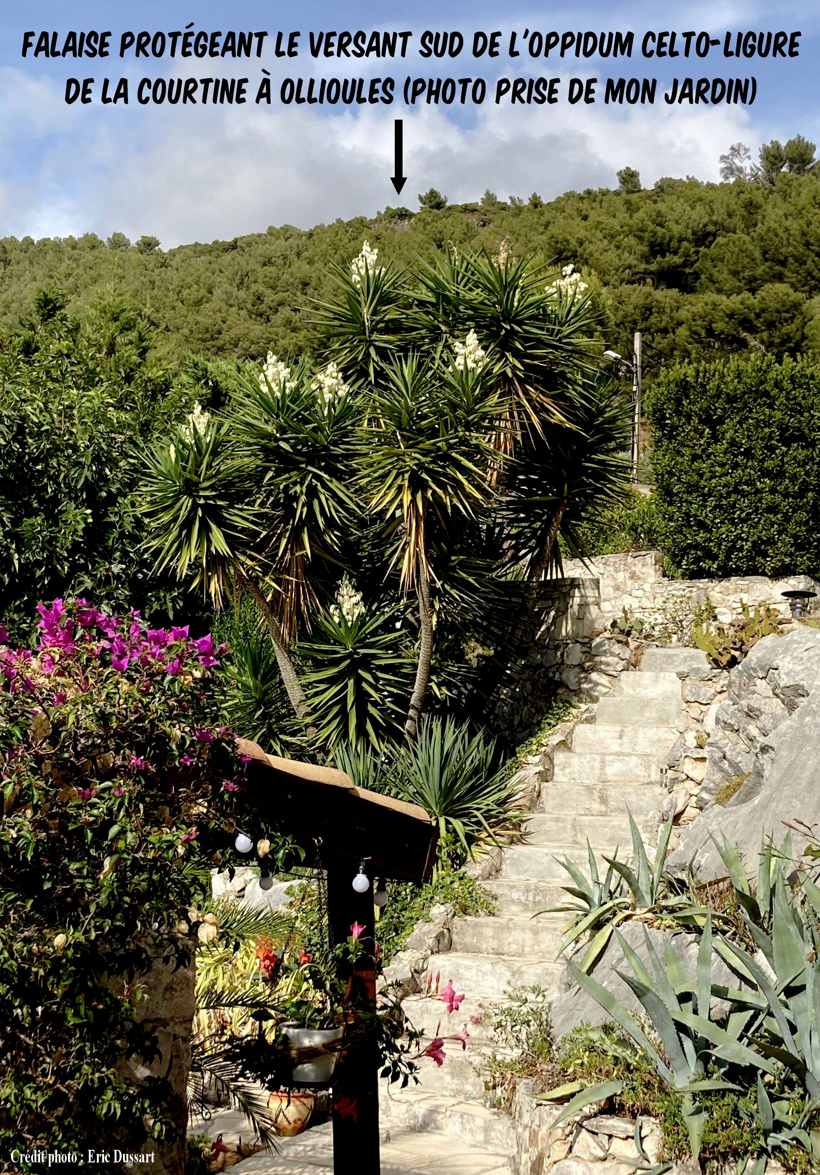 Vue (de mon jardin) sur la falaise protégeant le versant sud de l’oppidum celto-ligure de la la Courtine. Crédit photo : Eric Dussart