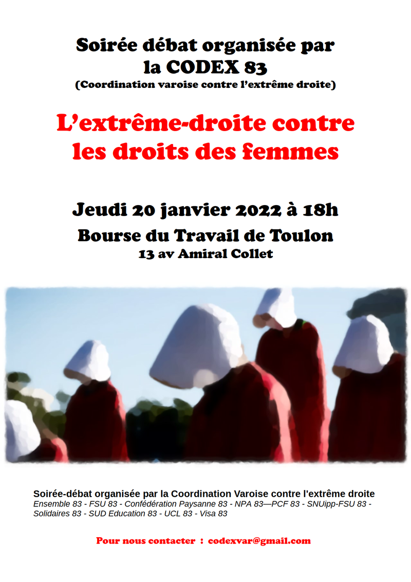 Jeudi 20 janvier 2022, la Coordination varoise contre l’extrême droite (CODEX 83) organise une soirée-débat sur le thème « L’extrême-droite contre les droits des femmes ». Rendez-vous à 18h à la Bourse du travail de Toulon, 13 avenue Amiral Collet.