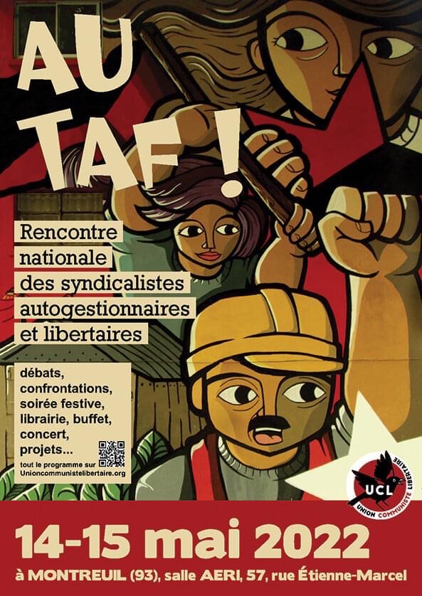 affiche de la rencontre nationale des syndicalistes autogestionnaires et libertaires organisée les 14 et 15 mai 2022 à Montreuil (93) par l’Union communiste libertaire (UCL)