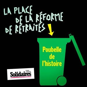 Solidaires_retraites_visuel_La-place-de-la-reforme-des-retraites La place de la réforme des retraites est dans les poubelles de l’Histoire (visuel de l’Union syndicale Solidaires) Partager : Imprimer(ouvre dans une nouvelle fenêtre) Imprimer Envoyer un lien par e-mail à un ami(ouvre dans une nouvelle fenêtre) E-mail Partager sur Facebook(ouvre dans une nouvelle fenêtre) Facebook Partager sur WhatsApp(ouvre dans une nouvelle fenêtre) WhatsApp Partager sur Telegram(ouvre dans une nouvelle fenêtre) Telegram Partager sur X(ouvre dans une nouvelle fenêtre) X Partager sur Mastodon(ouvre dans une nouvelle fenêtre) Mastodon Partager sur Bluesky(ouvre dans une nouvelle fenêtre) Bluesky J’aime chargement…