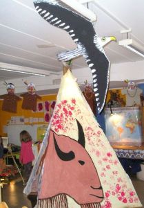 installation sur le thème des amérindiens dans la classe d’Eric Dussart lors de la journée « portes ouvertes » organisée en juin 2015 à l’école Jacques Prévert de Villeneuve d’Ascq