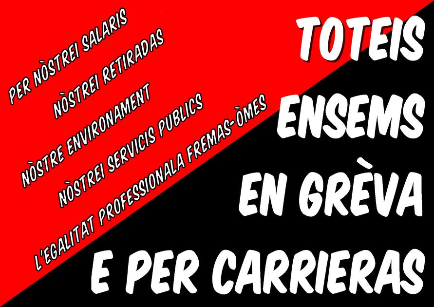 Affiche rouge et noire écrite en occitan provençal et appelant à faire grève et à manifester pour les salaires, les retraites, l’environnement, les services publics, l’égalité professionnelle femmes-hommes. Texte figurant sur l’affiche : Toteis ensems, en grèva e per carrieras ! Per nòstrei salaris, nòstrei retiradas, nòstre environament, nòstrei servicis publics ! Per l’egalitat professionala fremas-òmes !