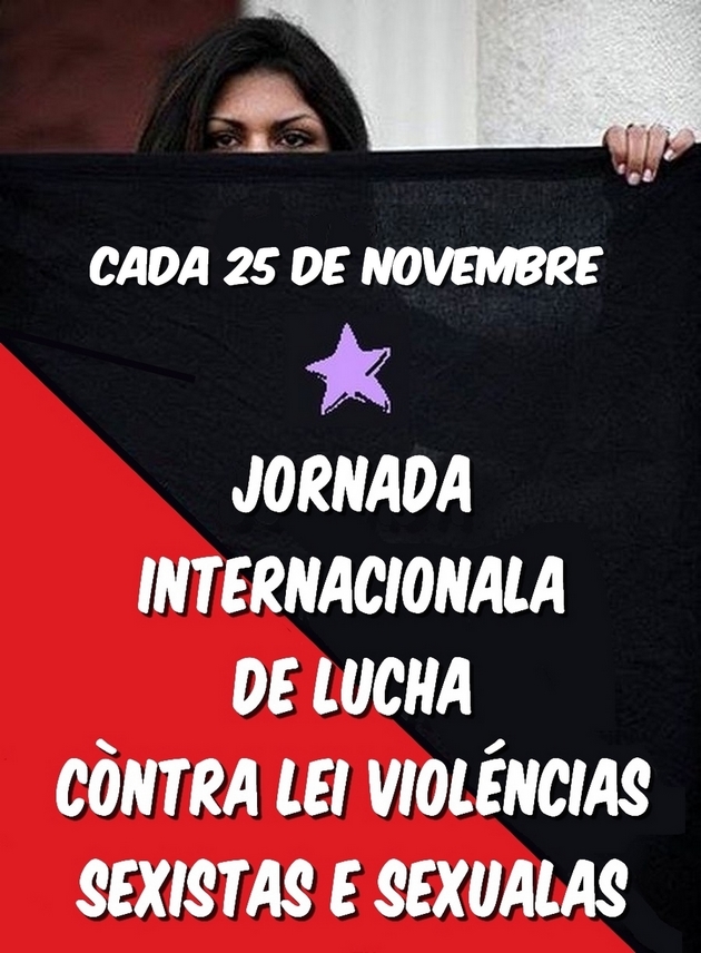 Femme tenant drapeau rouge et noir pour annoncer la journée internationale de lutte contre les violences sexistes et sexuelles (chaque 25 novembre). Langue utilisée : occitan provençal