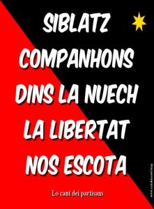 Affiche rouge et noire avec un extrait du « Chant des partisans » écrit en occitan provençal. Traduction : Sifflez, compagnons ! Dans la nuit, la liberté nous écoute…
