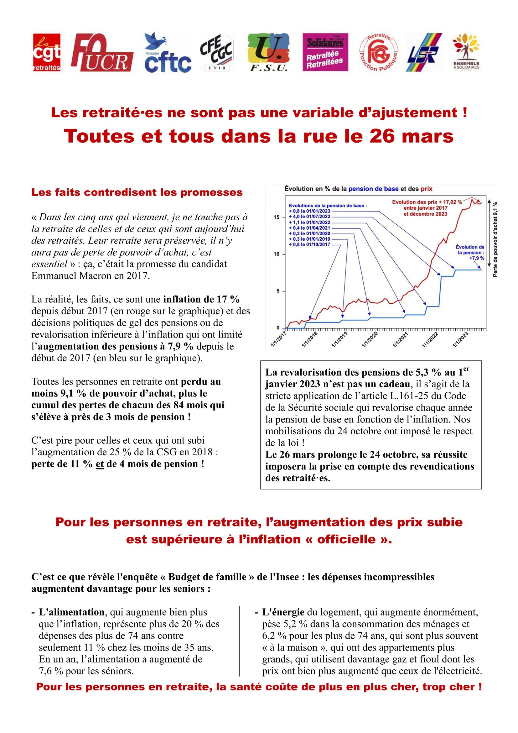 Mobilisation des retraité·es mardi 26 mars 2024 à Toulon (tract intersyndical – page 1)