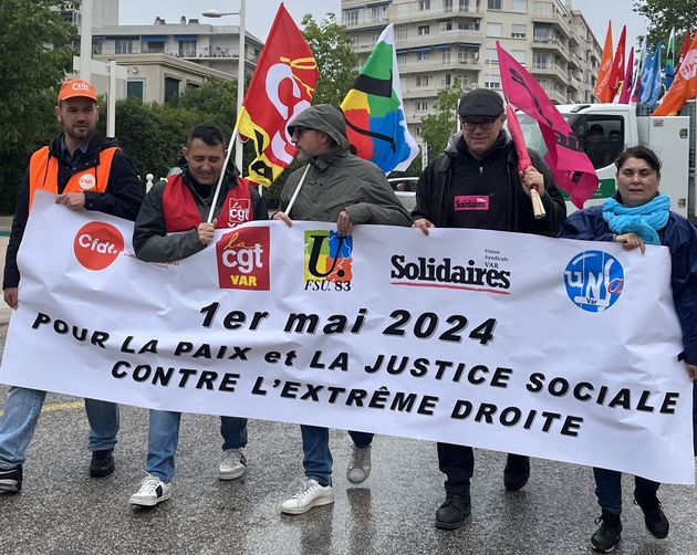 Toulon, 1er mai 2024 : banderole intersyndicale (CFDT – CGT – FSU – Solidaires – UNSA)