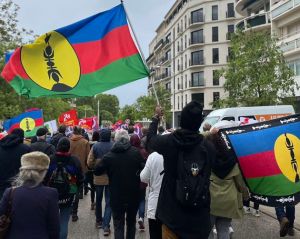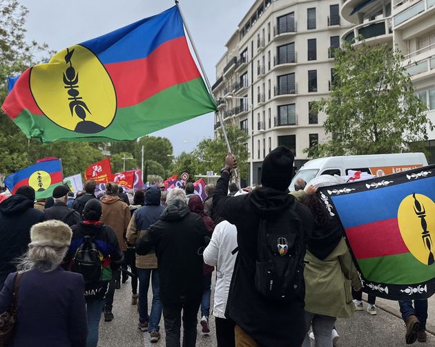 Toulon, 1er mai 2024 : drapeaux d’une association kanake proche de l’Union syndicale des travailleurs kanaks et des exploités (USTKE)