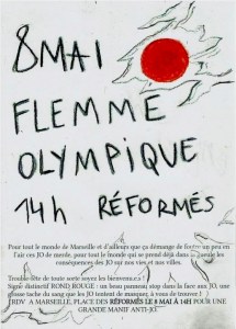 manif-no-jo_8mai2024_marseille Mercredi 8 mai 2024 à Marseille à l’occasion de l’arrivée de la flamme : grande manif contre les JO (14h, réformés) Partager : Imprimer(ouvre dans une nouvelle fenêtre) Imprimer Envoyer un lien par e-mail à un ami(ouvre dans une nouvelle fenêtre) E-mail Partager sur Facebook(ouvre dans une nouvelle fenêtre) Facebook Partager sur WhatsApp(ouvre dans une nouvelle fenêtre) WhatsApp Partager sur Telegram(ouvre dans une nouvelle fenêtre) Telegram Partager sur X(ouvre dans une nouvelle fenêtre) X Partager sur Mastodon(ouvre dans une nouvelle fenêtre) Mastodon Partager sur Bluesky(ouvre dans une nouvelle fenêtre) Bluesky J’aime chargement…