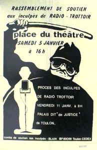 affiche annonçant un rassemblement de soutien aux inculpés de Radio Trottoir (radio libre anarchiste de la région toulonnaise) le 5 janvier 1980 à Toulon