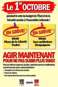 affiche de l’intersyndicale varoise CGT-FSU-Solidaires pour la grève et les manifestations du 1er octobre 2024 à Toulon et Draguignan pour nos retraites, nos salaires et nos services publics