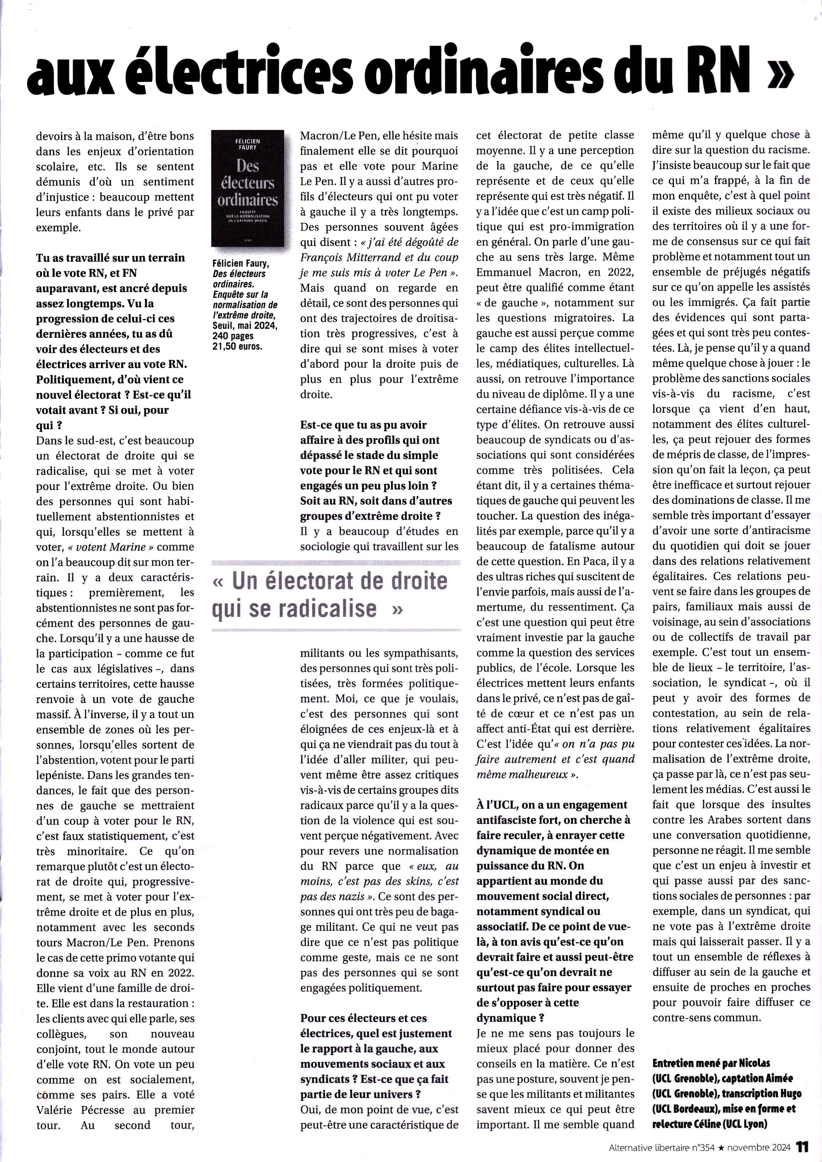 Page 2 de l’entretien entre « Alternative Libertaire » (mensuel de l’Union communiste libertaire) avec le sociologue Félicien Faury, auteur du livre « Des électeurs ordinaires. Enquête sur la normalisation de l’extrême droite » (Seuil – mai 2024 – 240 pages).