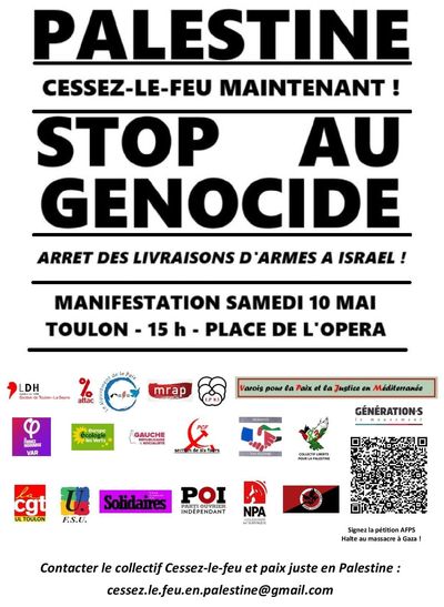 Depuis les attaques terroristes menées le 7 octobre 2023 par le Hamas, la riposte du gouvernement israélien a fait plus de 100 000 morts parmi la population civile gazaouie. Une proportion importante de ces victimes sont des enfants. À cela, il faut ajouter les dizaines de milliers de blessés, d’amputés et de disparus. Pour exiger un cessez-le-feu immédiat à Gaza, pour l’arrêt des livraisons d’armes à Israël, pour une paix juste et durable en Palestine, manifestation samedi 10 mai à Toulon (rendez-vous à 15h, place de l’opéra) !