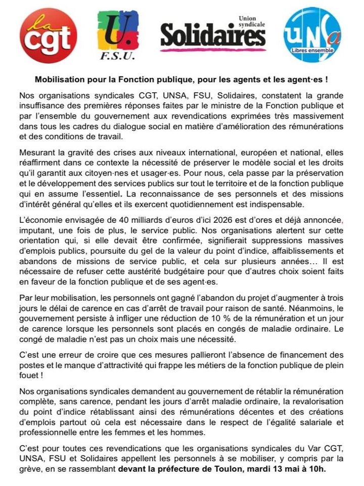 tract intersyndical pour la mobilisation fonction publique du 13 mai 2025 à Toulon