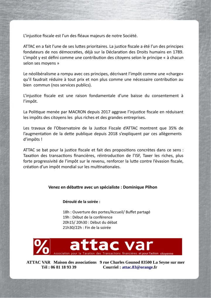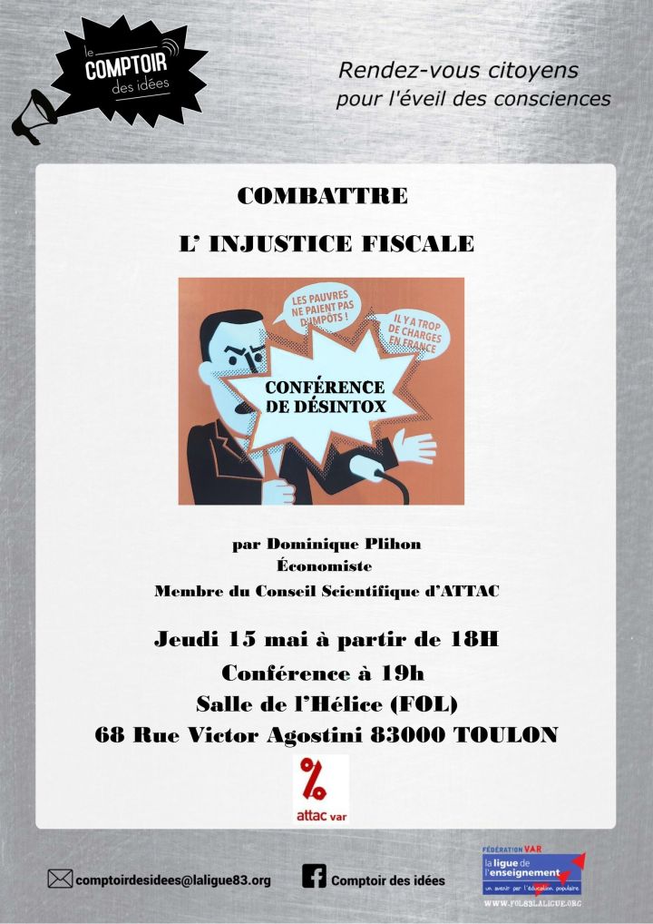 Jeudi 15 mai 2025, dans le cadre du « Comptoir des Idées », Attac Var organise une conférence de Dominique Plihon (économiste et membre du conseil scientifique d’Attac). Cette conférence intitulée « Combattre l’injustice fiscale » se déroulera de 19 h à 20 h 15 et sera suivie d’un débat. Rendez-vous dès 18 h, salle de l’Hélice, 68 rue Victor Agostini à Toulon.