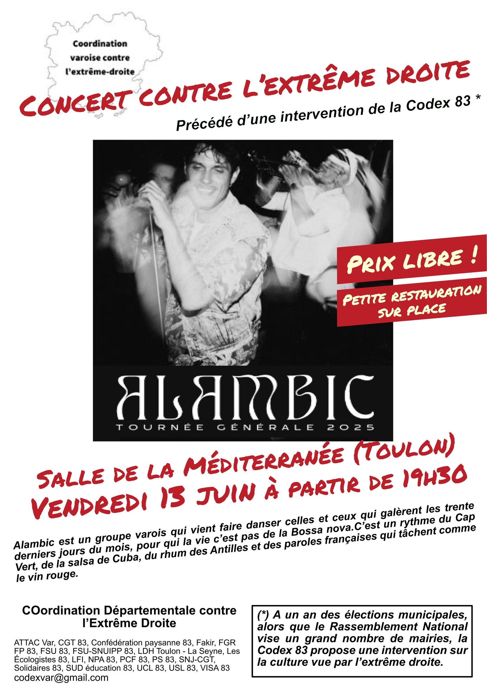 La CODEX 83 (COordination Départementale contre l’EXtrême-droite) organise un concert du groupe varois Alambic vendredi 13 juin 2025 à la Maison de la Méditerranée, rue Commandant Infernet, Toulon.