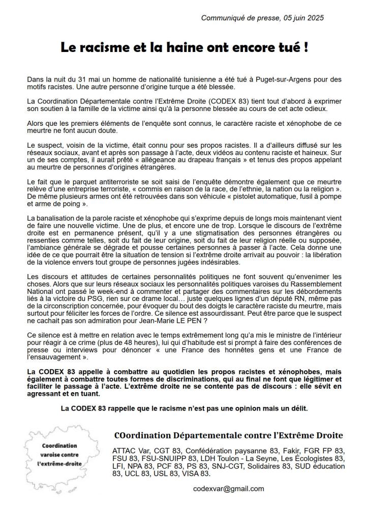 Ci-dessous le communiqué publié ce jour par la Coordination Départementale contre l’Extrême Droite (CODEX 83) suite au meurtre raciste commis le 31 mai à Puget-sur-Argens.
