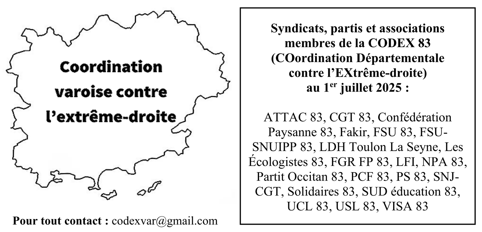 Le 13 juin 2025 à Toulon, la Coordination départementale contre l’extrême-droite (CODEX 83) organisait un concert précédé d’une intervention sur la culture face à l’extrême-droite. Ci-dessous, en deux parties distinctes, l’enregistrement vidéo de cette intervention…