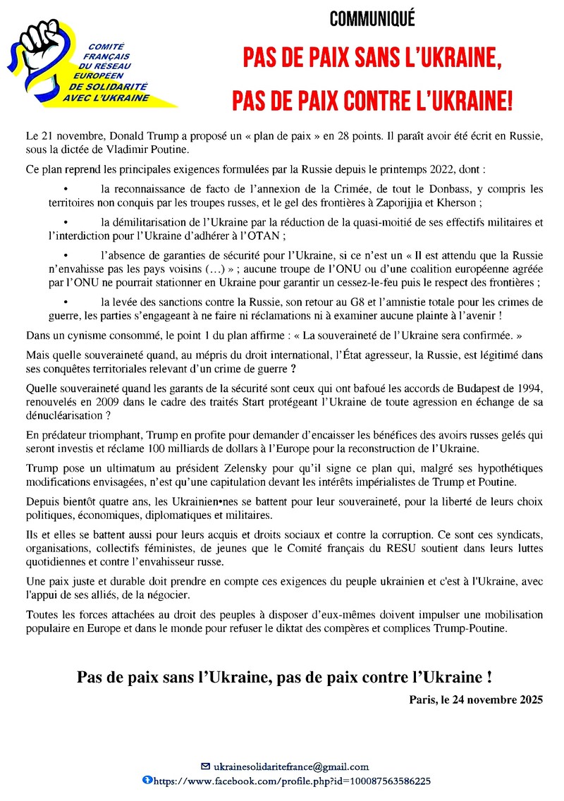 Communiqué du comité français du RESU (Réseau Européen de Solidarité avec l’Ukraine) sur l’accord-négociations Trump/Poutine :