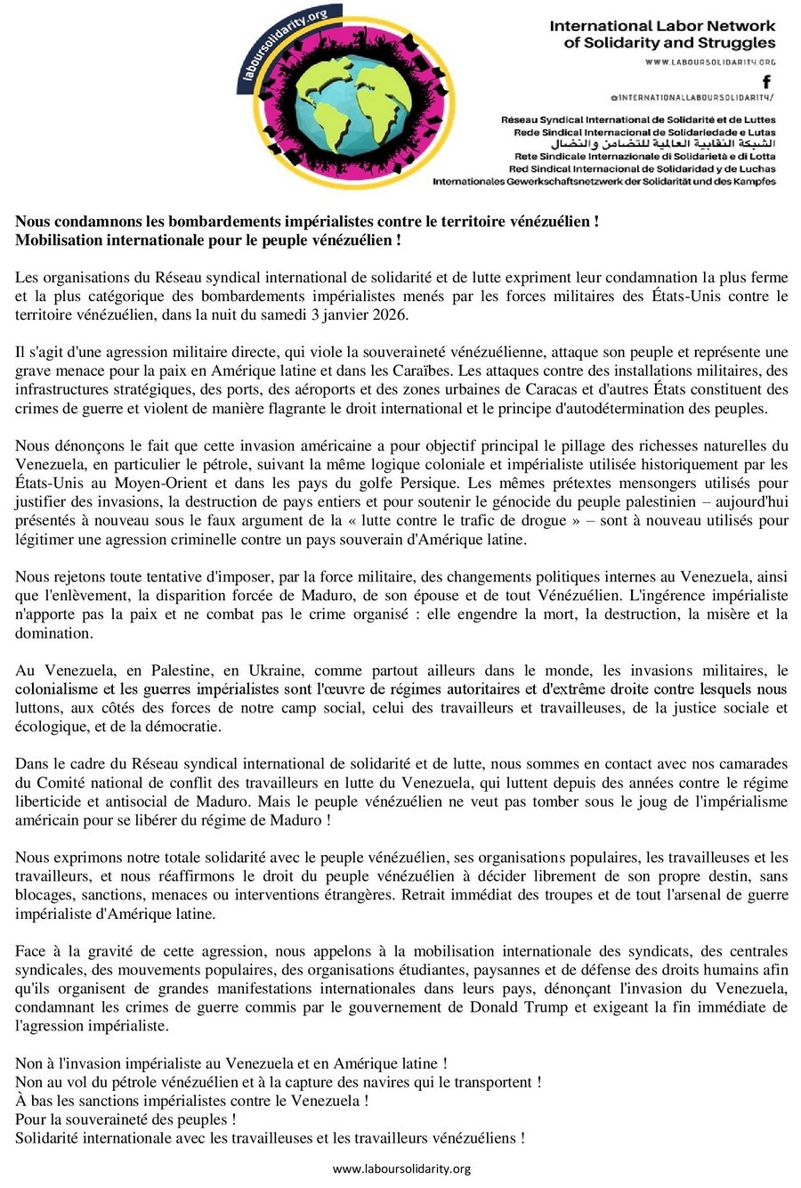 Communiqué du Réseau syndical international de solidarité et de luttes :
