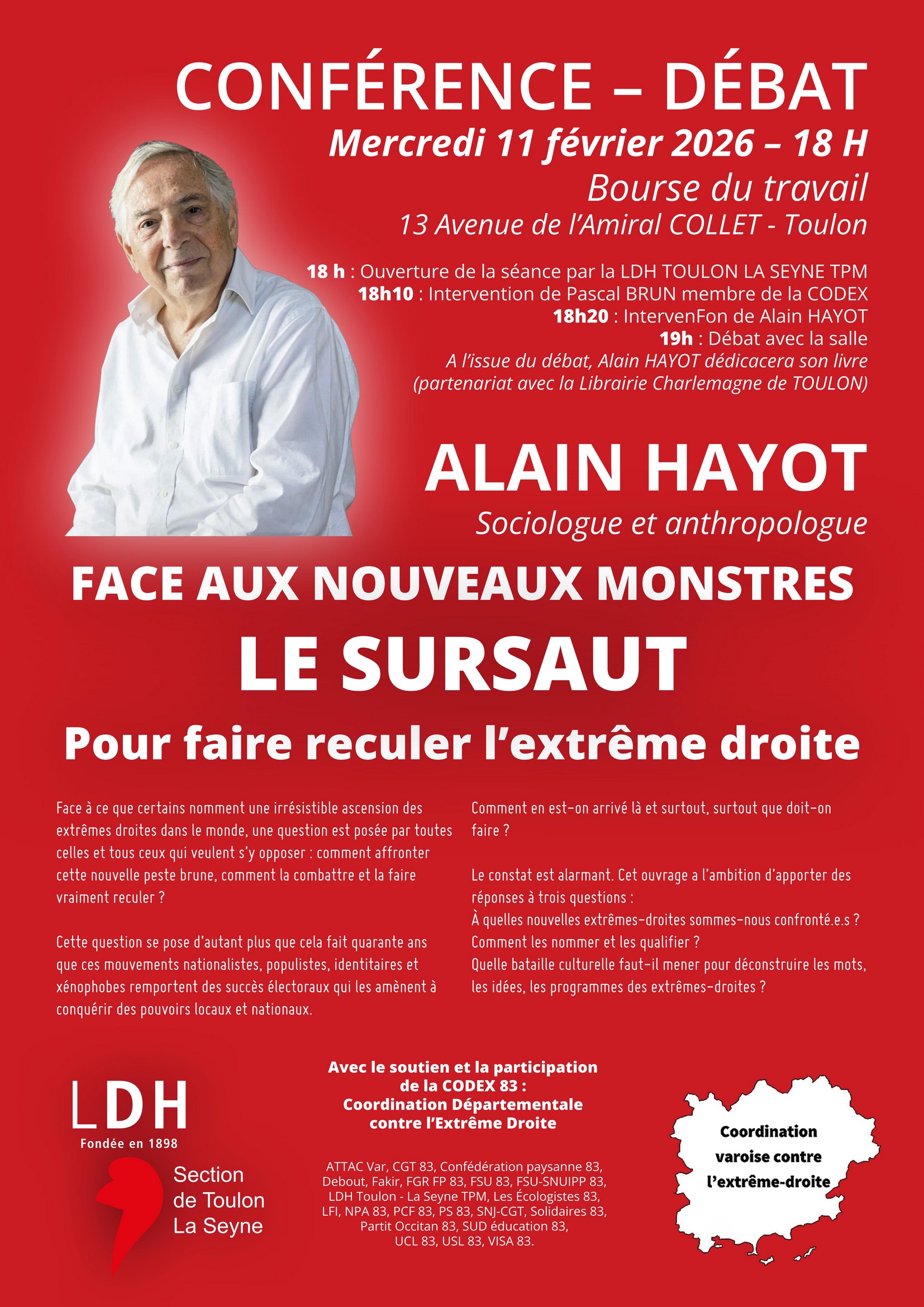 Mercredi 11 février 2026 à 18 h (Bourse du travail, 13 avenue de l’amiral Collet, Toulon), la Ligue des Droits de l’Homme (LDH) de Toulon La Seyne organisent avec le soutien de la Coordination départementale contre l’extrême droite (cf. note 1) une conférence-débat en compagnie d’Alain Hayot, sociologue et anthropologue auteur du livre « Face au nouveaux monstres, le sursaut pour faire reculer les extrêmes droites » (cf. note 2).