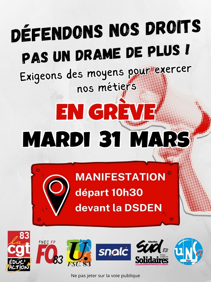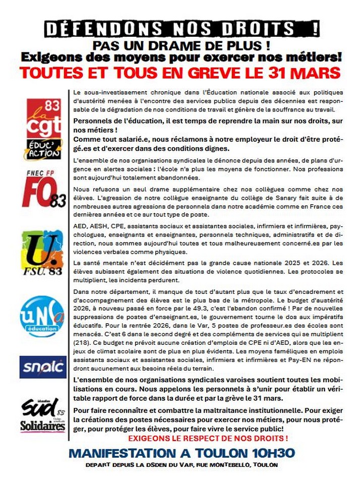 Mardi 31 mars 2026, l’intersyndicale académique du Var appelle les personnels de l’Éducation nationale à se mettre en grève et à manifester à Toulon (départ à 10 h 30 devant la DSDEN) pour exiger des moyens leur permettant d’exercer leurs métiers. Ci-dessous un extrait du tract d’appel :