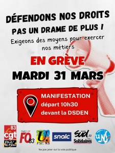 greve_educ-nat_31-mars-2026_affiche-var affiche de l’intersyndicale académique du Var pour la grève du 31 mars 2026 dans l’Éducation nationale Partager : Imprimer(ouvre dans une nouvelle fenêtre) Imprimer Envoyer un lien par e-mail à un ami(ouvre dans une nouvelle fenêtre) E-mail Partager sur Facebook(ouvre dans une nouvelle fenêtre) Facebook Partager sur WhatsApp(ouvre dans une nouvelle fenêtre) WhatsApp Partager sur Telegram(ouvre dans une nouvelle fenêtre) Telegram Partager sur X(ouvre dans une nouvelle fenêtre) X Partager sur Mastodon(ouvre dans une nouvelle fenêtre) Mastodon Partager sur Bluesky(ouvre dans une nouvelle fenêtre) Bluesky J’aime chargement…