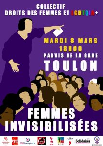affiche du collectif « Droits des femmes et LGBTQIA+ » de Toulon pour le rassemblement organisé le mardi 8 mars 2022 à 18h sur le parvis de la gare de Toulon dans le cadre de la Journée internationale de lutte pour les droits des femmes.