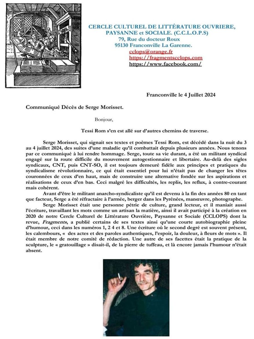 Page 1 de l’hommage rendu à Serge Morisset par le Cercle culturel de littérature ouvrière, paysanne et sociale.