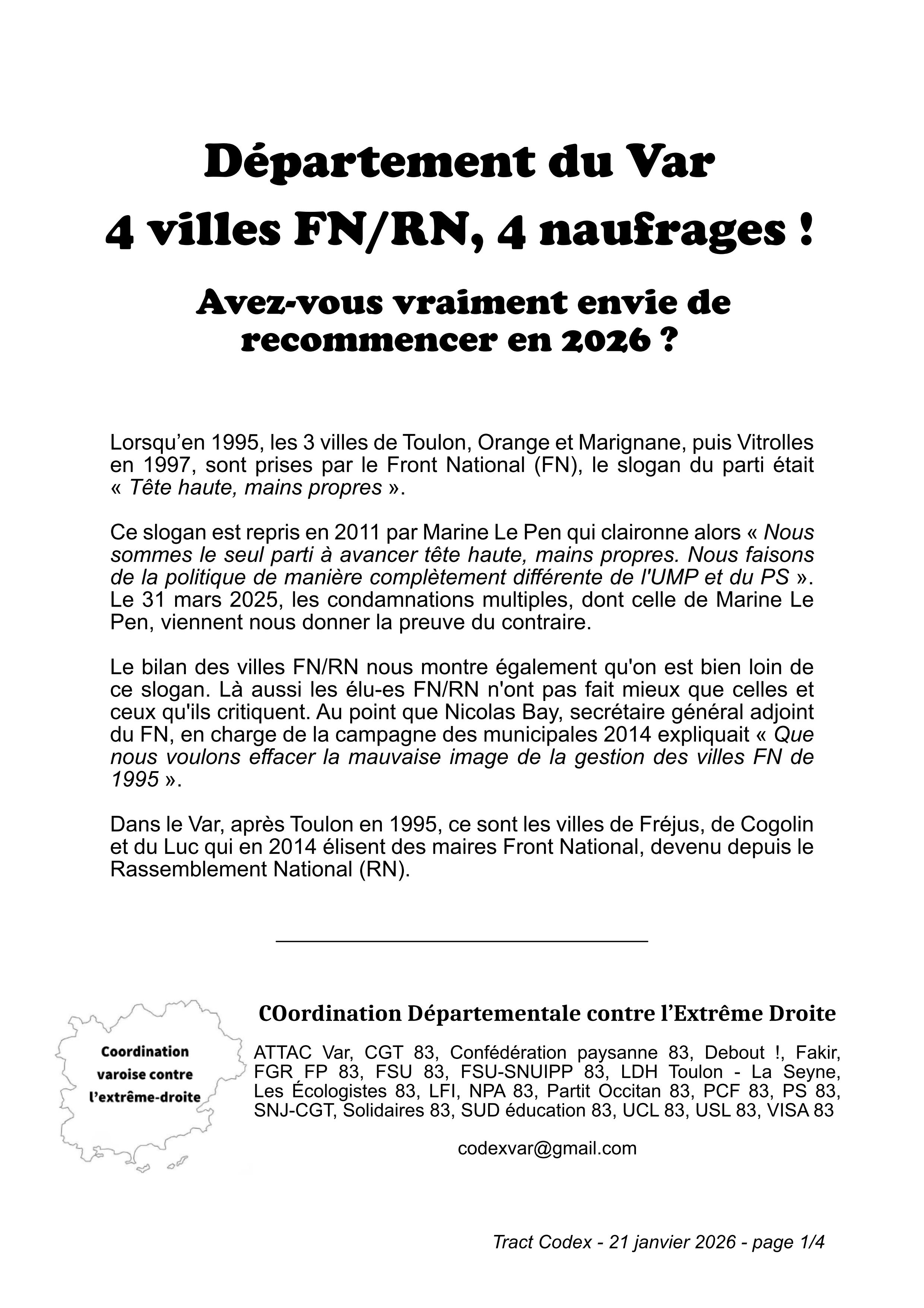 Page 1 du tract publié le 21 janvier 2026 par la CODEX 83 (COordination Départementale contre l’Extrême Droite)