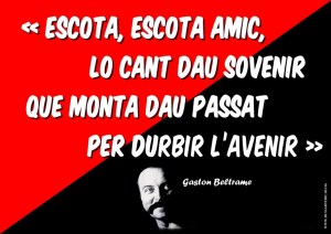 Citation de Gaston Beltrame (sur fond rouge et noir) extraite de la chanson « Martin Bidoret » (1975). En occitan provençal : « Escota, escota amic lo cant dau sovenir que monta dau passat per durbir l’avenir ». Traduction en français : Écoute, écoute ami, le chant du souvenir qui monte du passé pour ouvrir l’avenir.