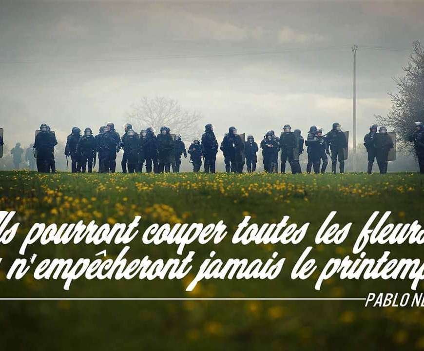 À quelques jours du printemps, voici un texte de Pablo Neruda mis en musique et chanté en mai 2016 par la Compagnie Jolie Môme en plein cœur de la lutte contre la loi El Khomri (loi travail n° 1), une lutte contre laquelle le gouvernement de l’époque n’avait pas hésité à jeter ses chiens de garde de manière répétée et particulièrement violente. Aujourd’hui, cette chanson … Continuer de lire Ils peuvent empêcher les fleurs de pousser, ils n’empêcheront jamais le printemps d’arriver