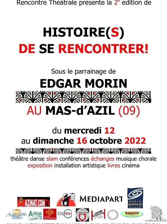 Le festival « Histoire(s) de se rencontrer ! » se déroulera sous le parrainage d’Edgar Morin du 12 au 16 oct. 2022 au Mas d’Azil en Ariège (09). Artistes, conférenciers/cières et spectateurs/trices questionneront la transmission et la narration de l’Histoire par différents biais (théâtre, danse, slam, conférences, échanges, musique, chorale, exposition, installation artistique, livres et cinéma) et à travers différents thèmes (l’univers concentrationnaire, la traite négrière, le colonialisme, le travail forcé, le génocide des Tutsi, le sexisme, les racismes, les migrations, l’écocide…). Continuer de lire « Histoire(s) de se rencontrer » du 12 au 16 octobre au Mas-d’Azil : un festival engagé !