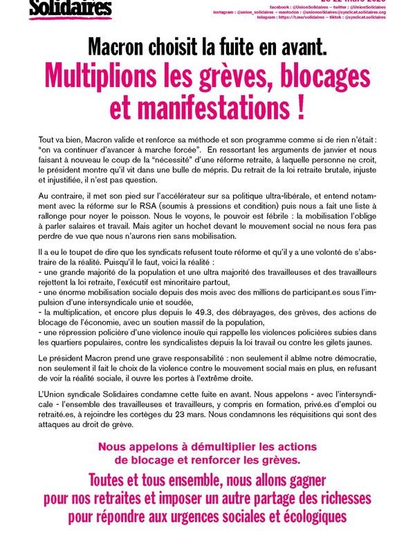 Communiqué de l’Union syndicale Solidaires suite à l’intervention télévisée de Macron ce jour à 13h : Macron valide et renforce sa méthode et son programme comme si de rien n’était : « on va continuer d’avancer à marche forcée ». En ressortant les arguments de janvier et nous faisant à nouveau le coup de la « nécessité » d’une réforme retraite, à laquelle personne ne croit, le président montre qu’il vit dans une bulle de mépris. Continuer de lire Macron choisit la fuite en avant. Multiplions les grèves, blocages et manifestations !
