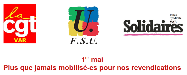 Pour une rupture profonde en matière salariale et pour les pensions, pour arrêter de malmener les services publics, pour défendre et conforter notre modèle social, pour la transition écologique, pour lutter contre les semeurs de haine, pour la paix et la solidarité internationale, l’intersyndicale CGT, FSU et Solidaires du Var appellent salarié-es, agent-es public-ques, jeunes, retraité-es ou encore les privé-es d’emploi à participer aux […] Continuer de lire Appel intersyndical à manifester le 1er mai 2022 à Toulon, Draguignan et Saint-Raphaël